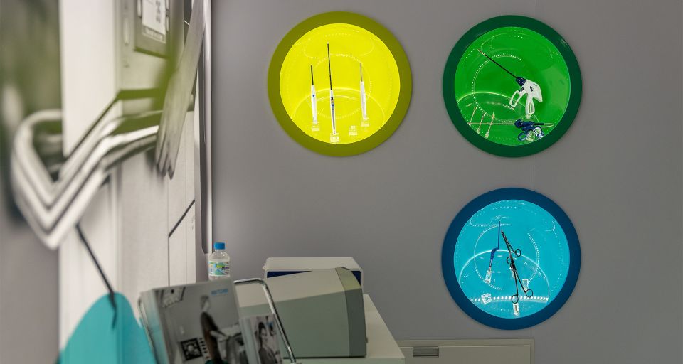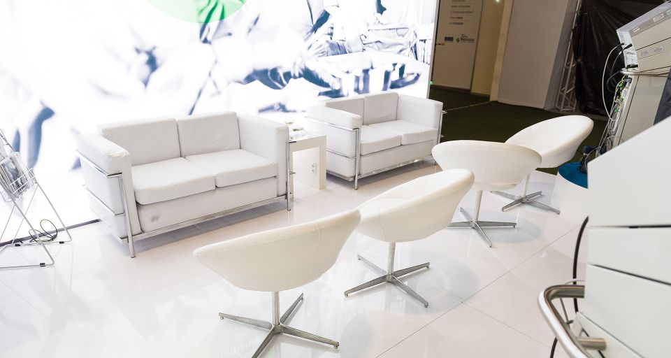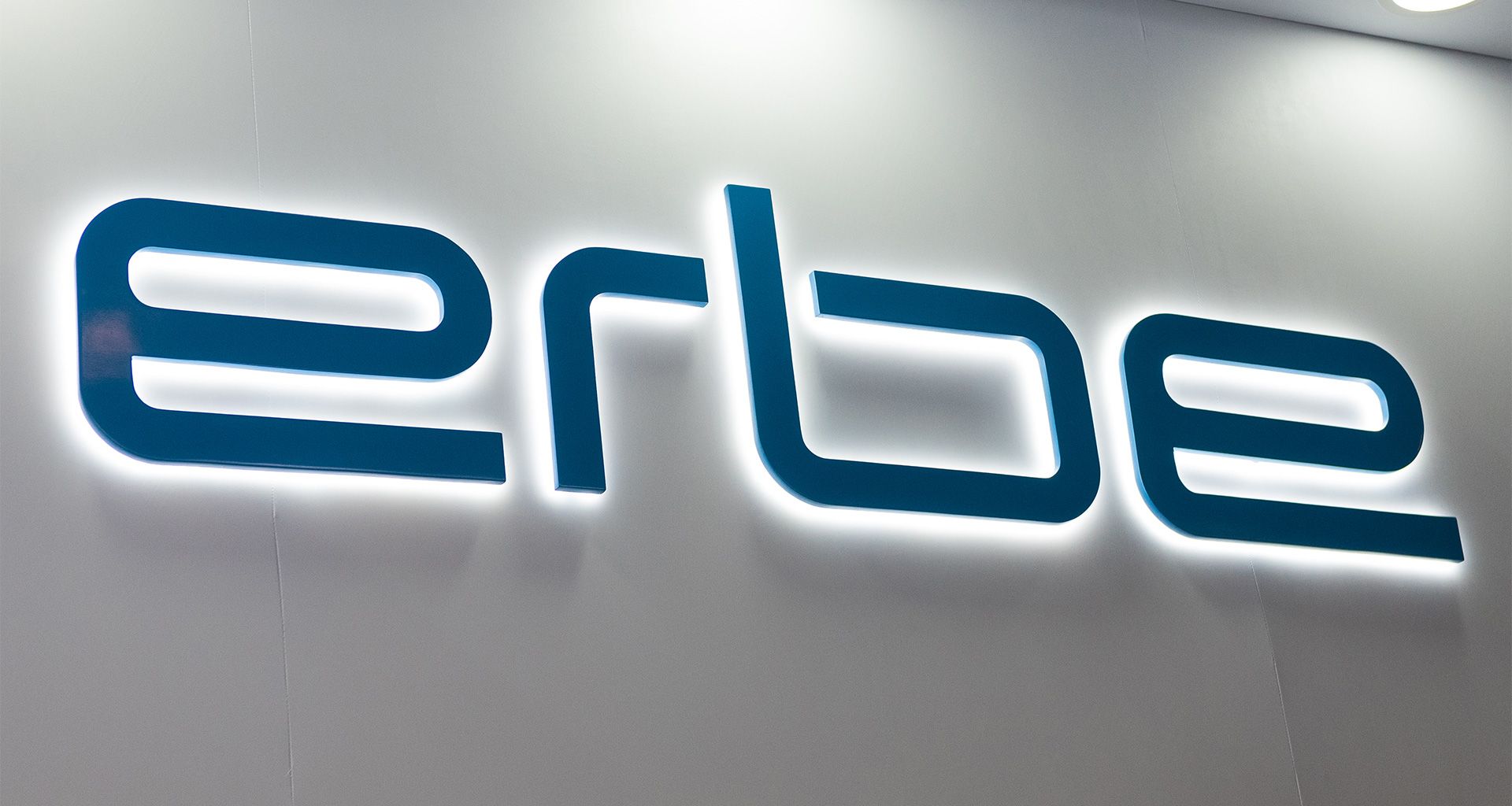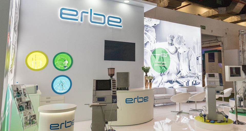 Com design moderno, o estande da Erbe na Feira Hospitalar 2018 tinha como objetivo valorizar a apresentação dos produtos de forma inovadora, moderna e cativante. Os equipamentos com carrinhos ganharam plataformas redondas de diferentes alturas. O branco sóbrio predominante foi pontilhado com elementos redondos nas cores azul, verde e amarelo, acalorando o ambiente.