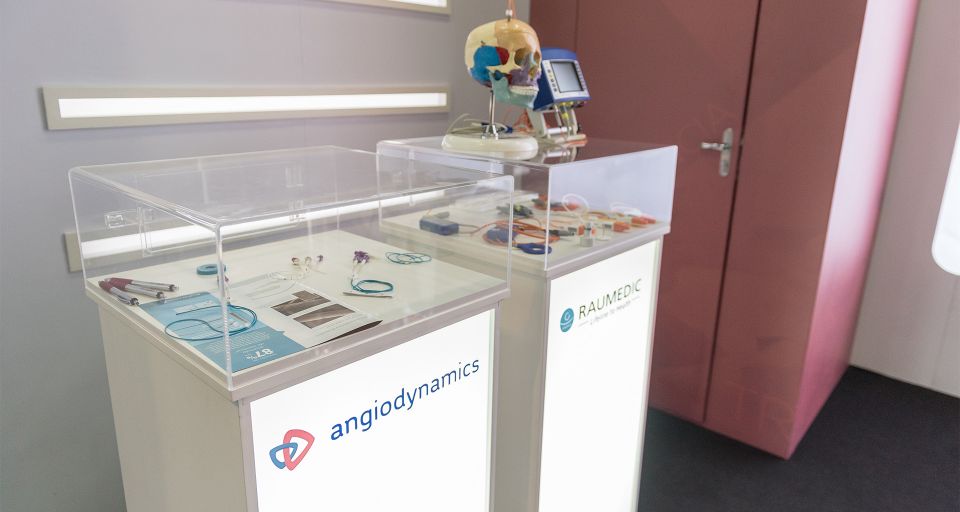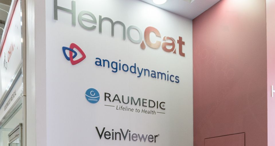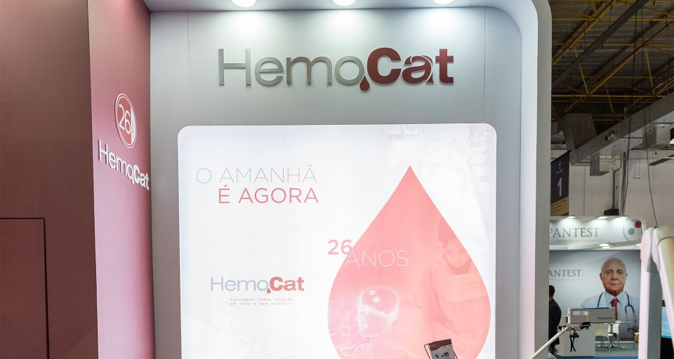 O estande da Hemocat na Feira Hospitalar 2018 se caracterizou por beleza, simplicidade e objetividade. Suas marcas foram bem apresentadas em painéis retroiluminados e acabamento detalhista.