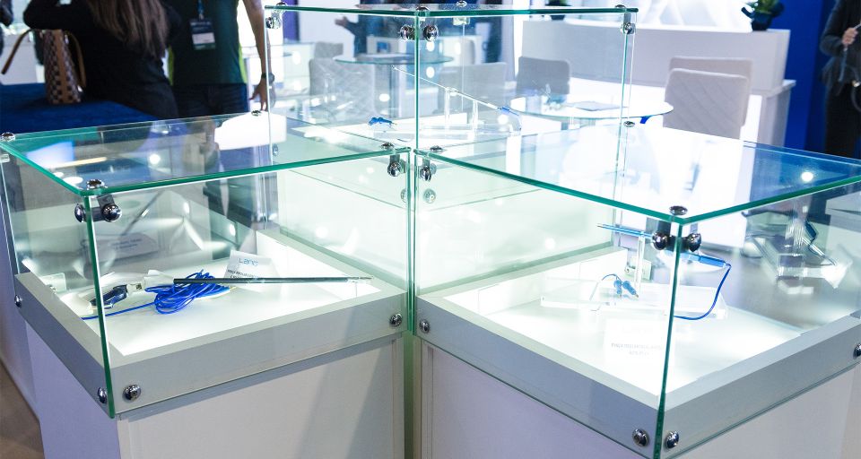Os produtos, de dimensões pequenas, forma exibidos em balcões na cor branca e em vidro para valorizar sua apresentação. Além de fazer negócios, a empresa com certeza deixou uma ótima impressão em cada detalhe feito sob medida.